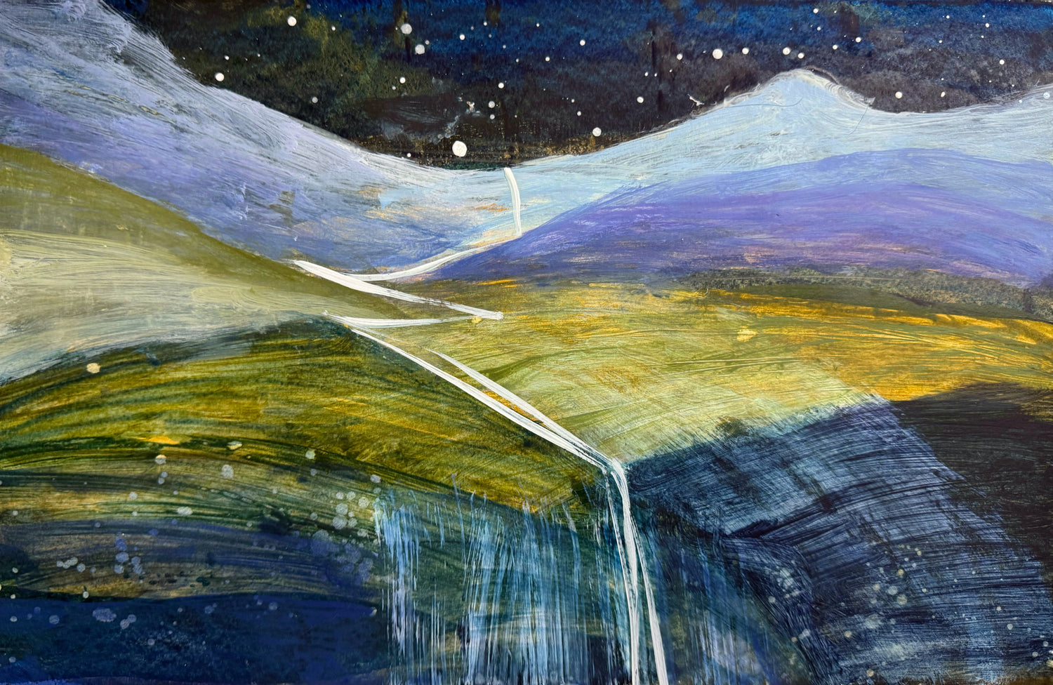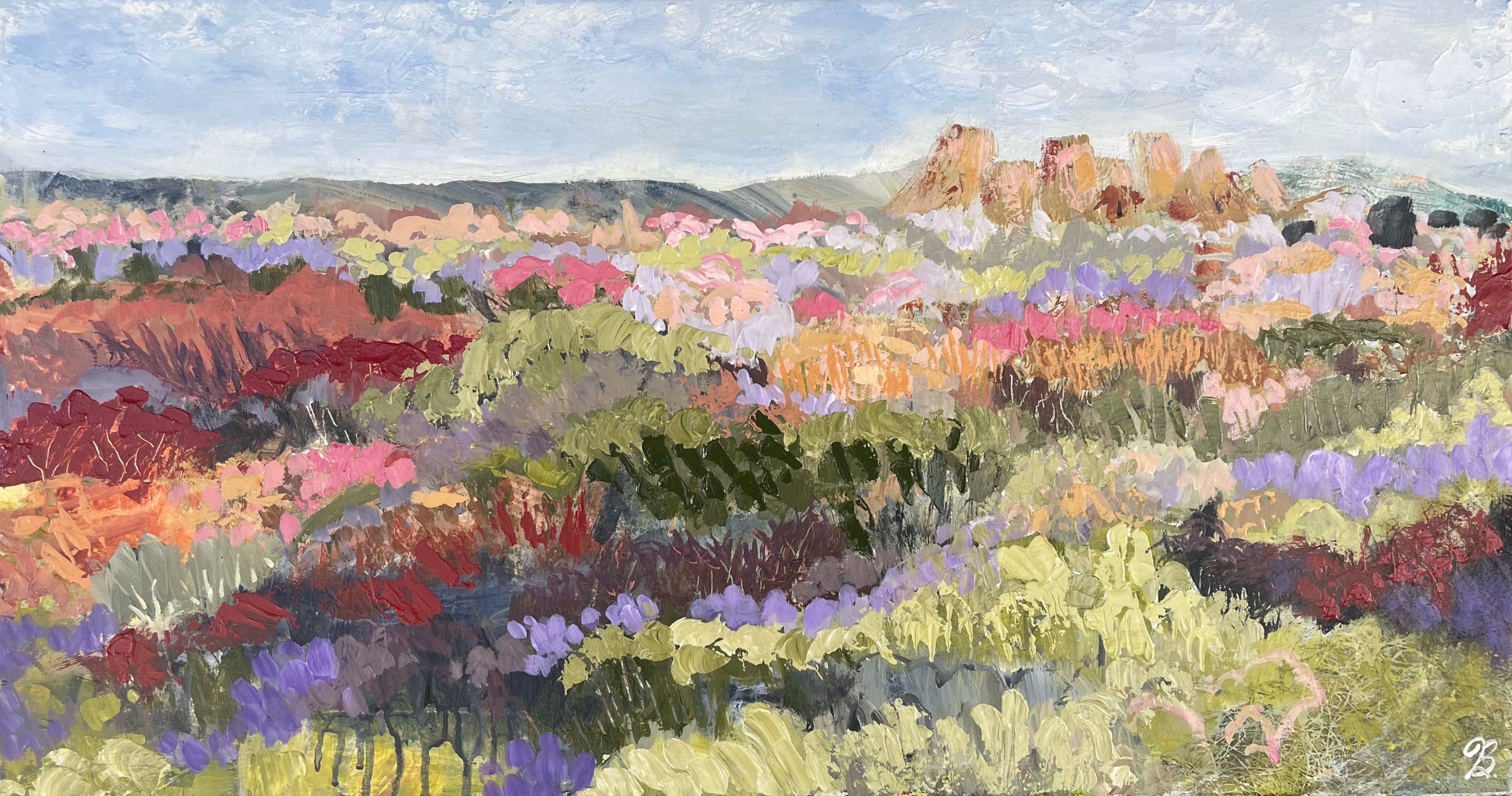 Each painting begins as a feeling rather than a plan. Layers build, textures emerge, and the image finds its own rhythm. My palette often drifts between earthy greens and coral skies, to deep hues reminiscent of mountain streams.