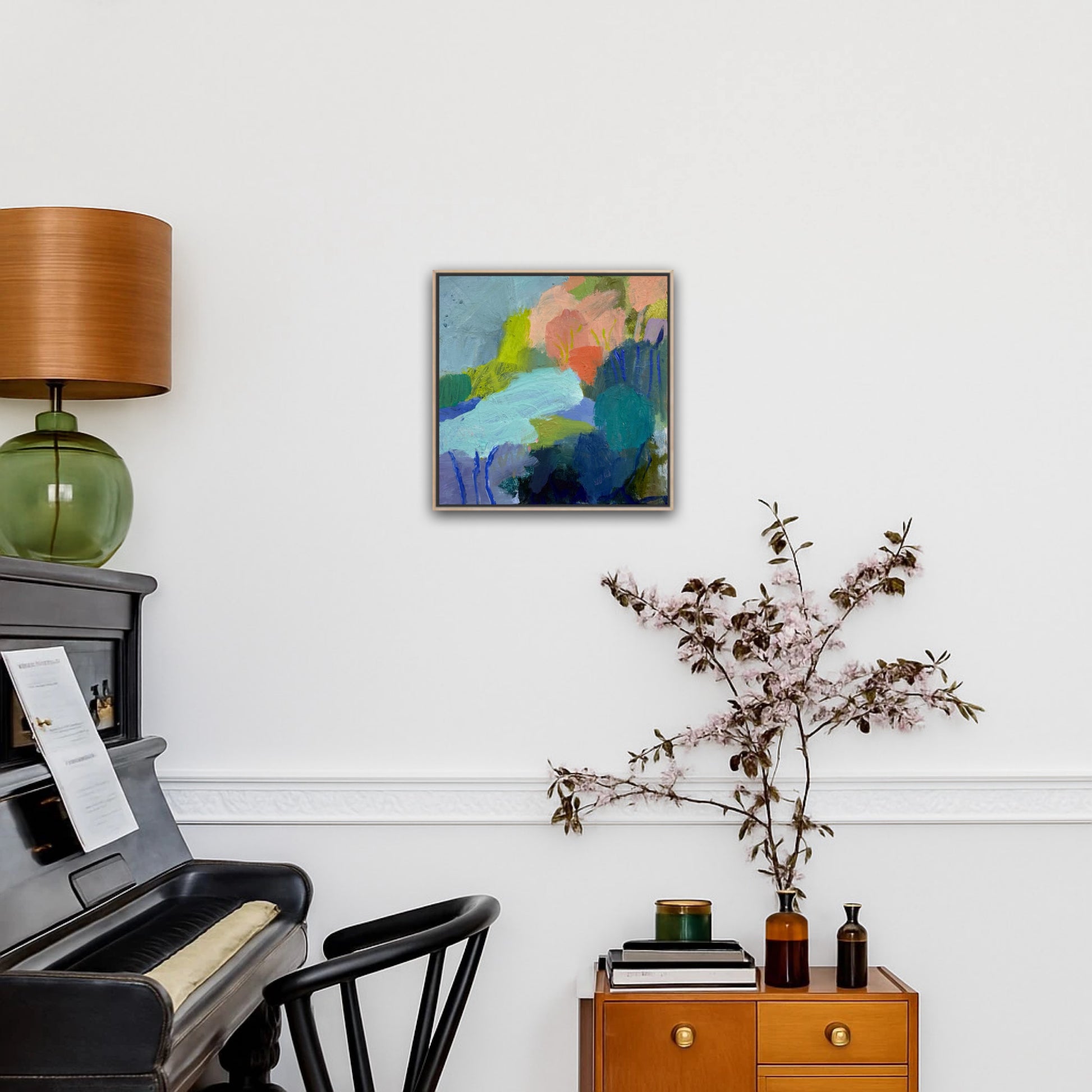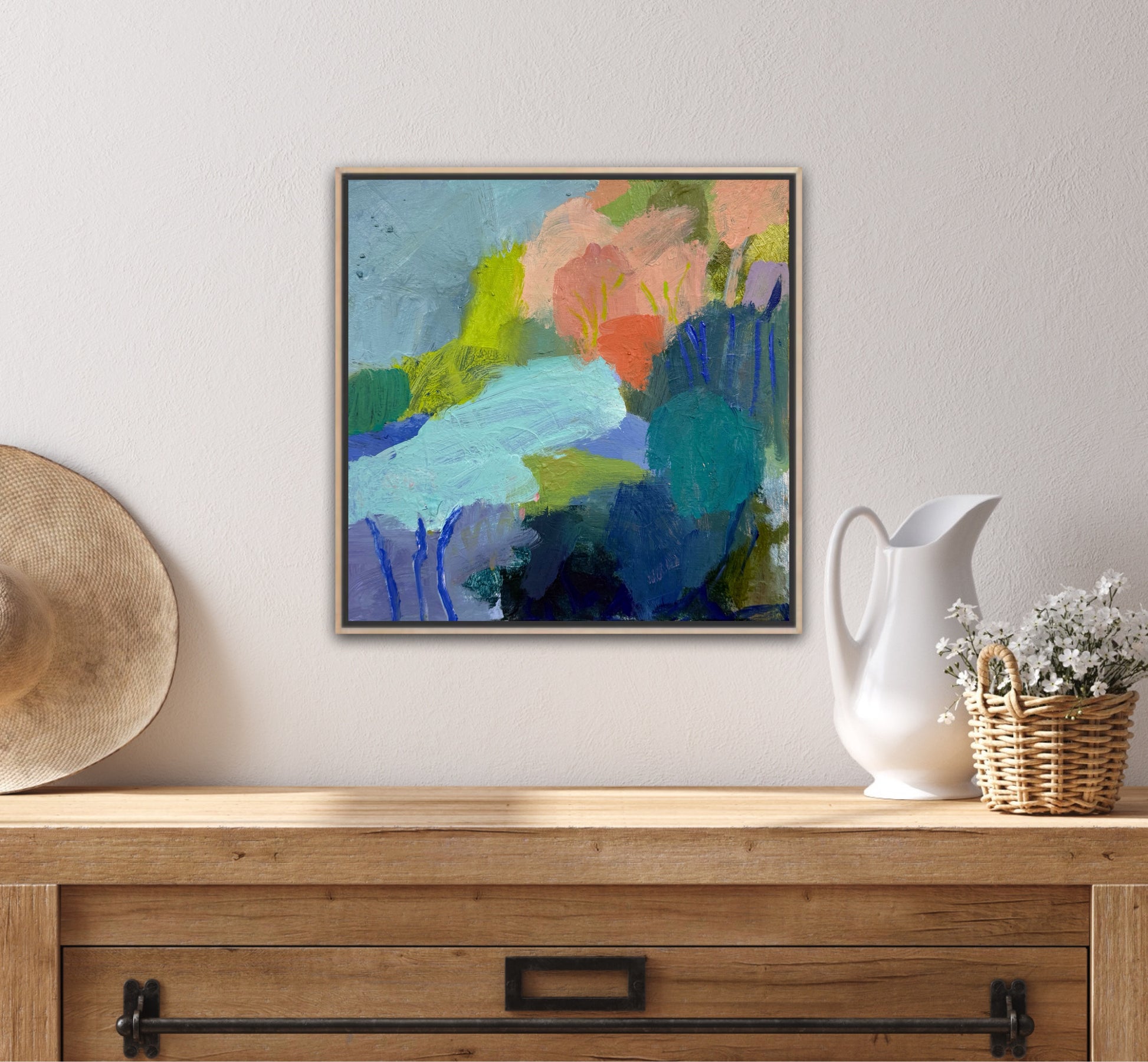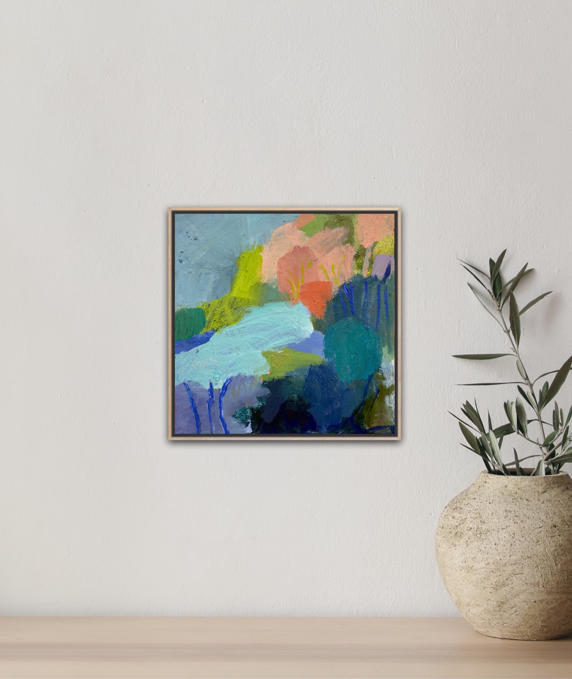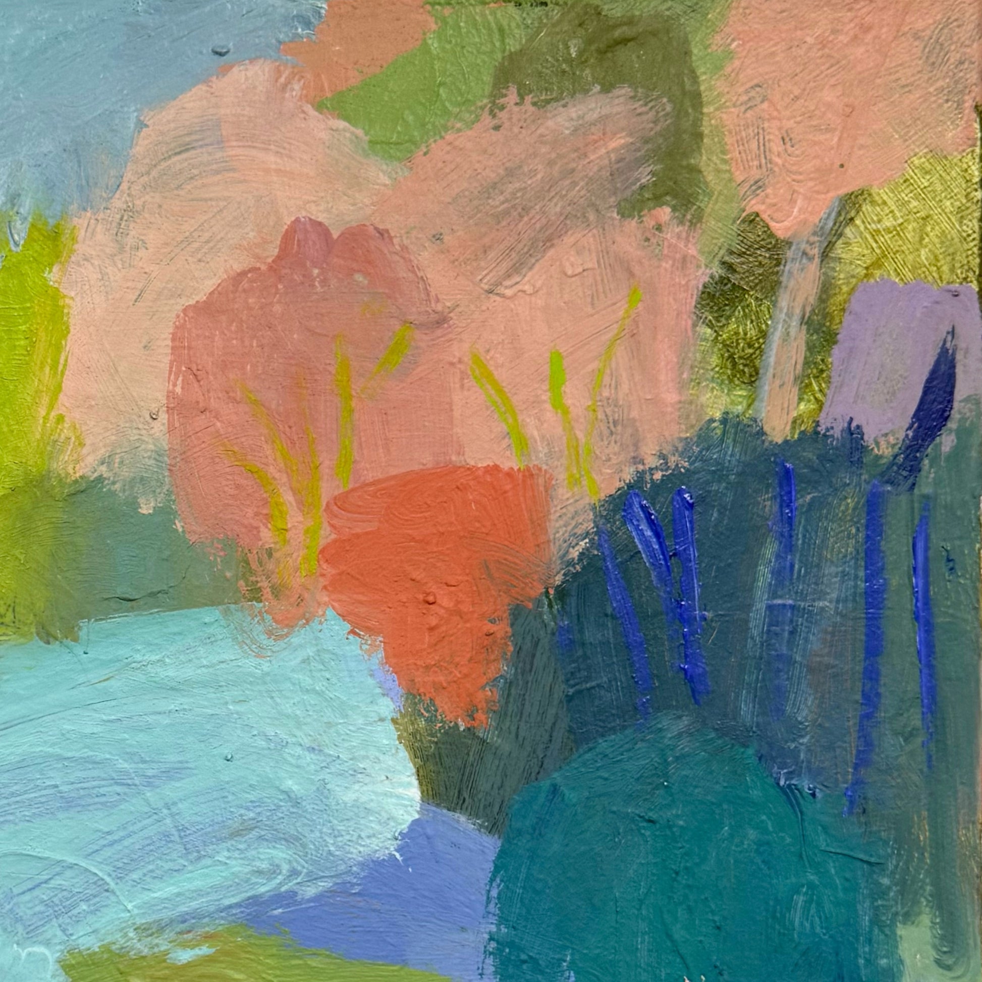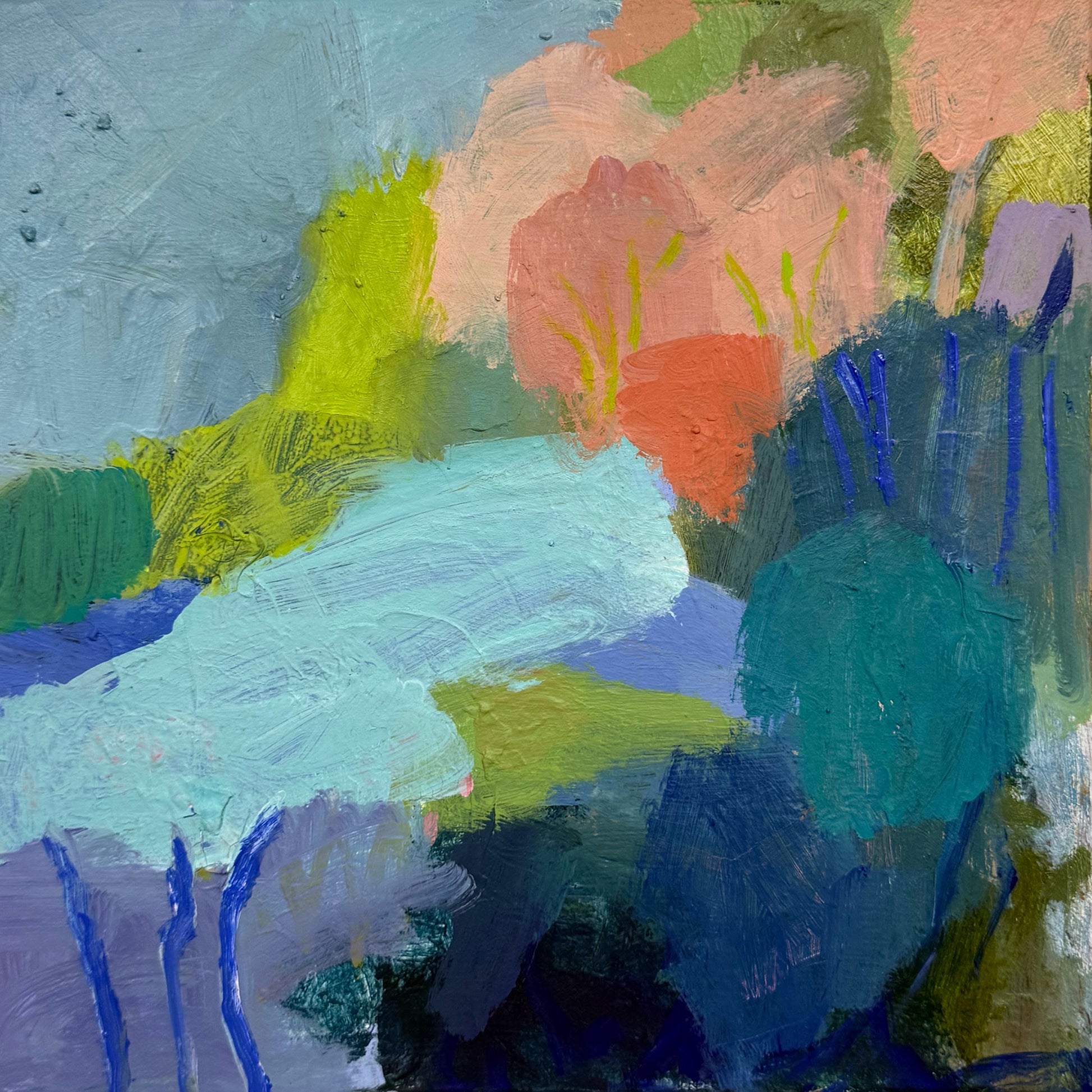 This piece is built in layers, with dragged brushwork, scumbled passages and bolder strokes that cut through the softer fields. It sits comfortably between abstraction and place, letting you decide whether it’s a creek bend, a lagoon pocket, or a memory of water.