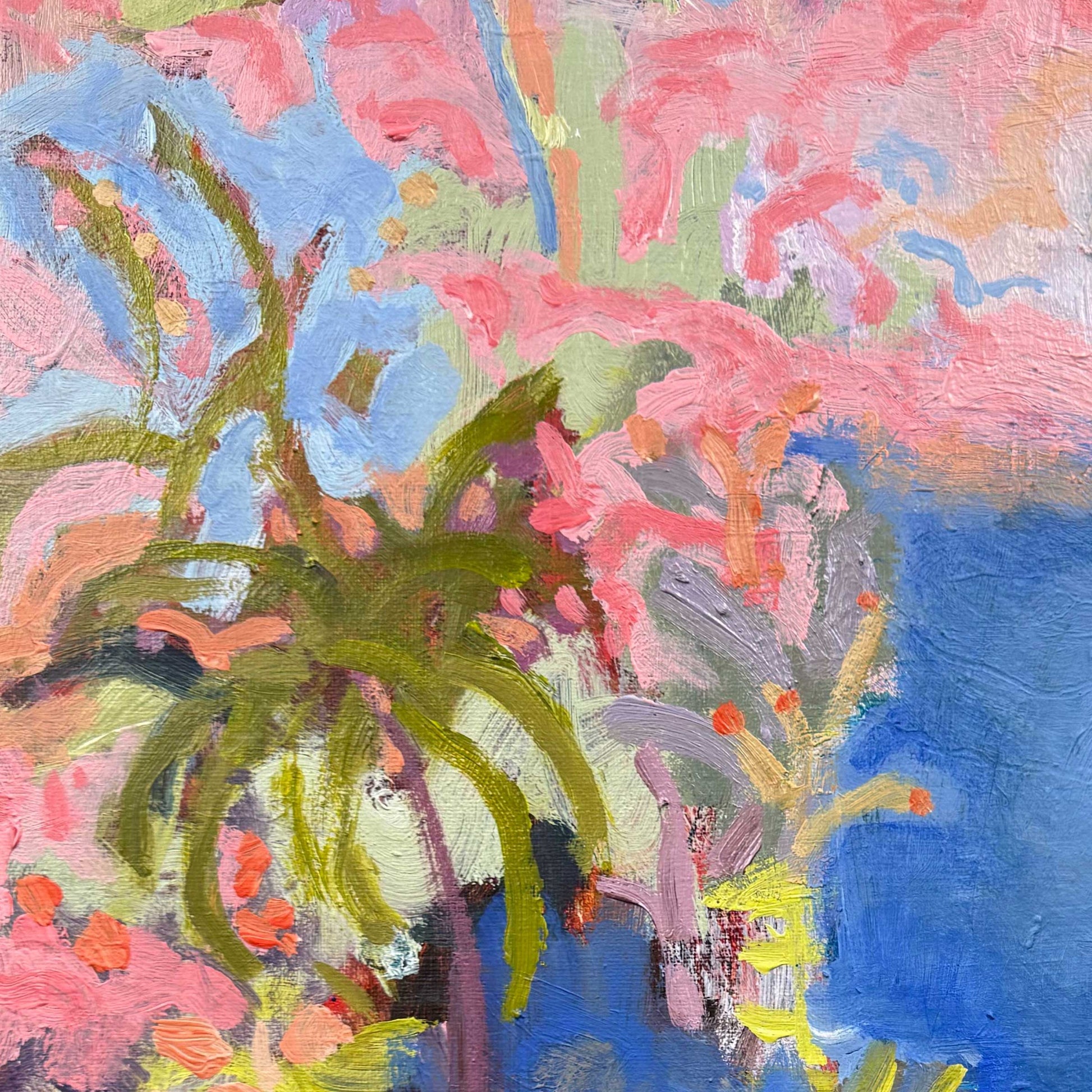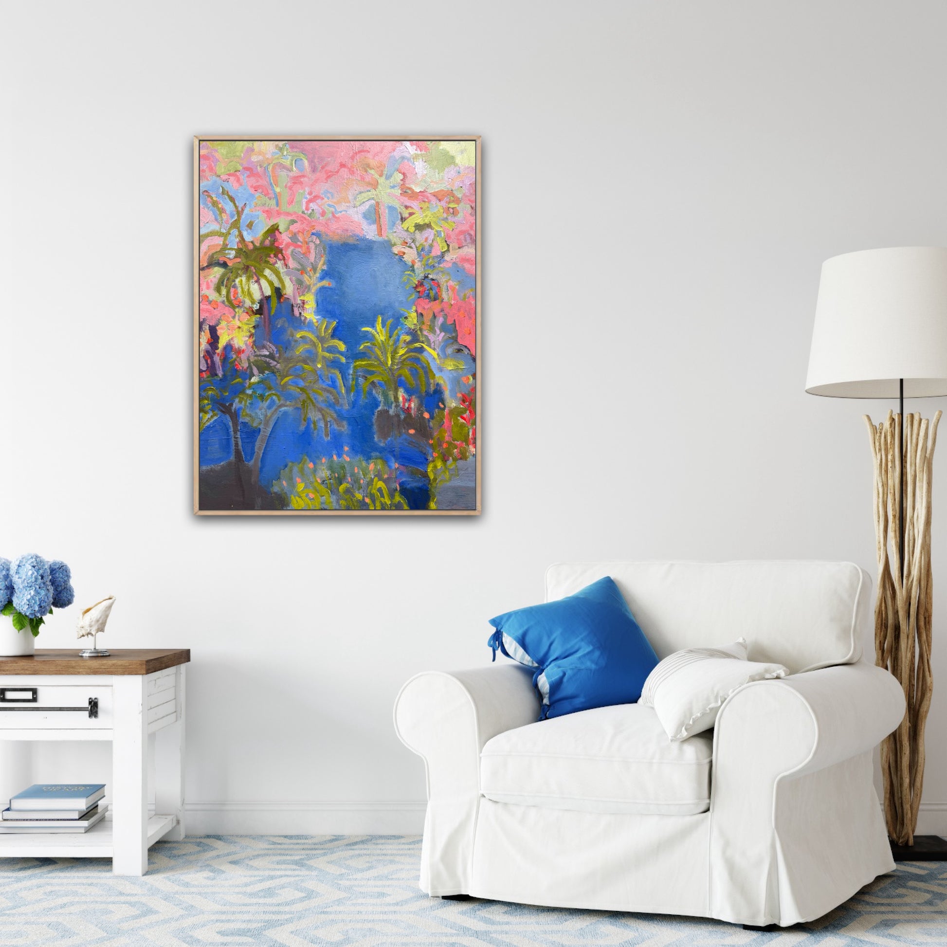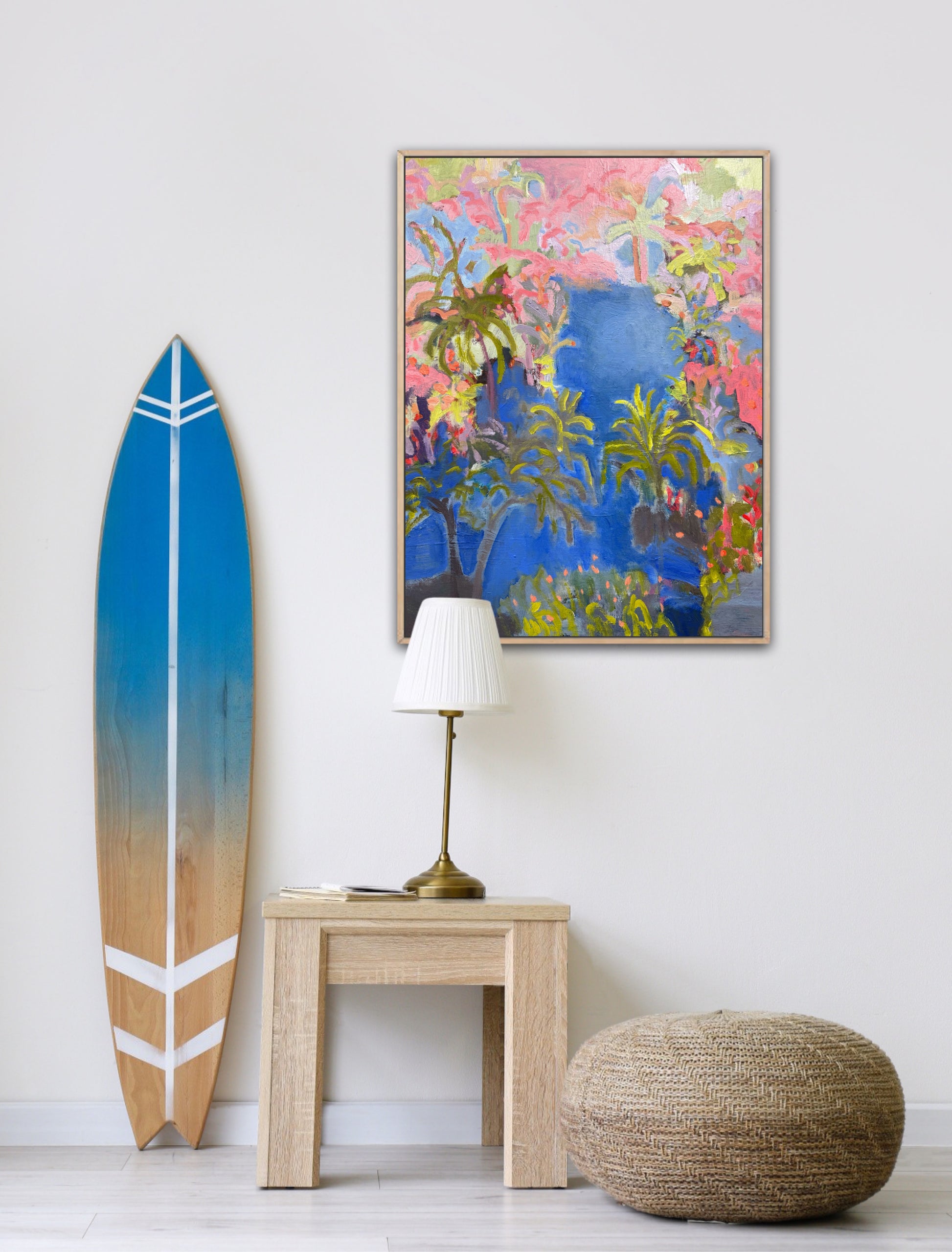 A lush daydream in paint, Secret Lagoon immerses the viewer in a cascade of coral pinks, deep cobalt blues and lush yellow-greens. Layers of expressive brushwork evoke the shifting light and movement of a tropical garden viewed through memory — part imagined, part remembered.